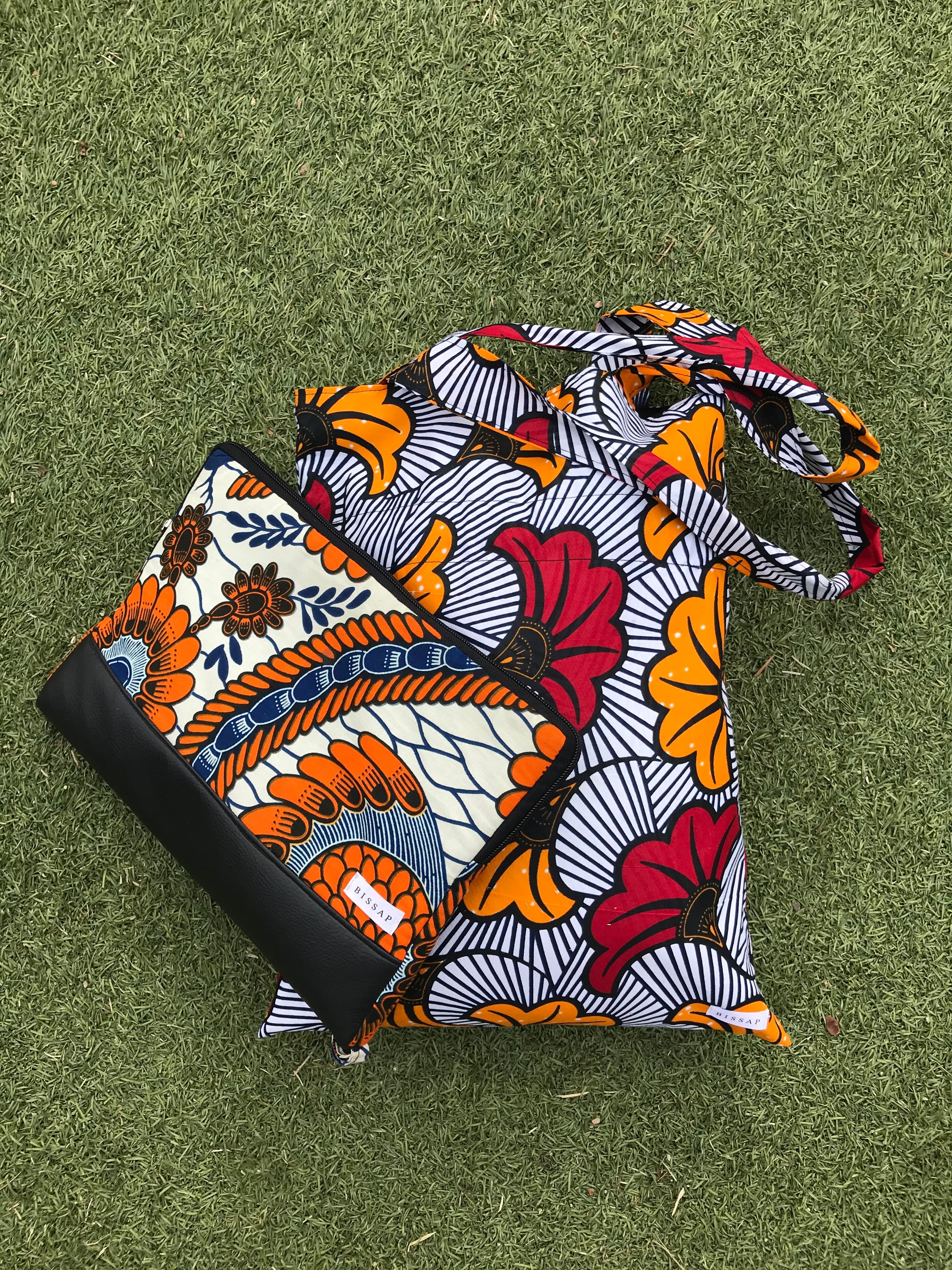 西アフリカのセネガルで仕立てた【BISSAP】オリジナルの巾着トートバッグ。