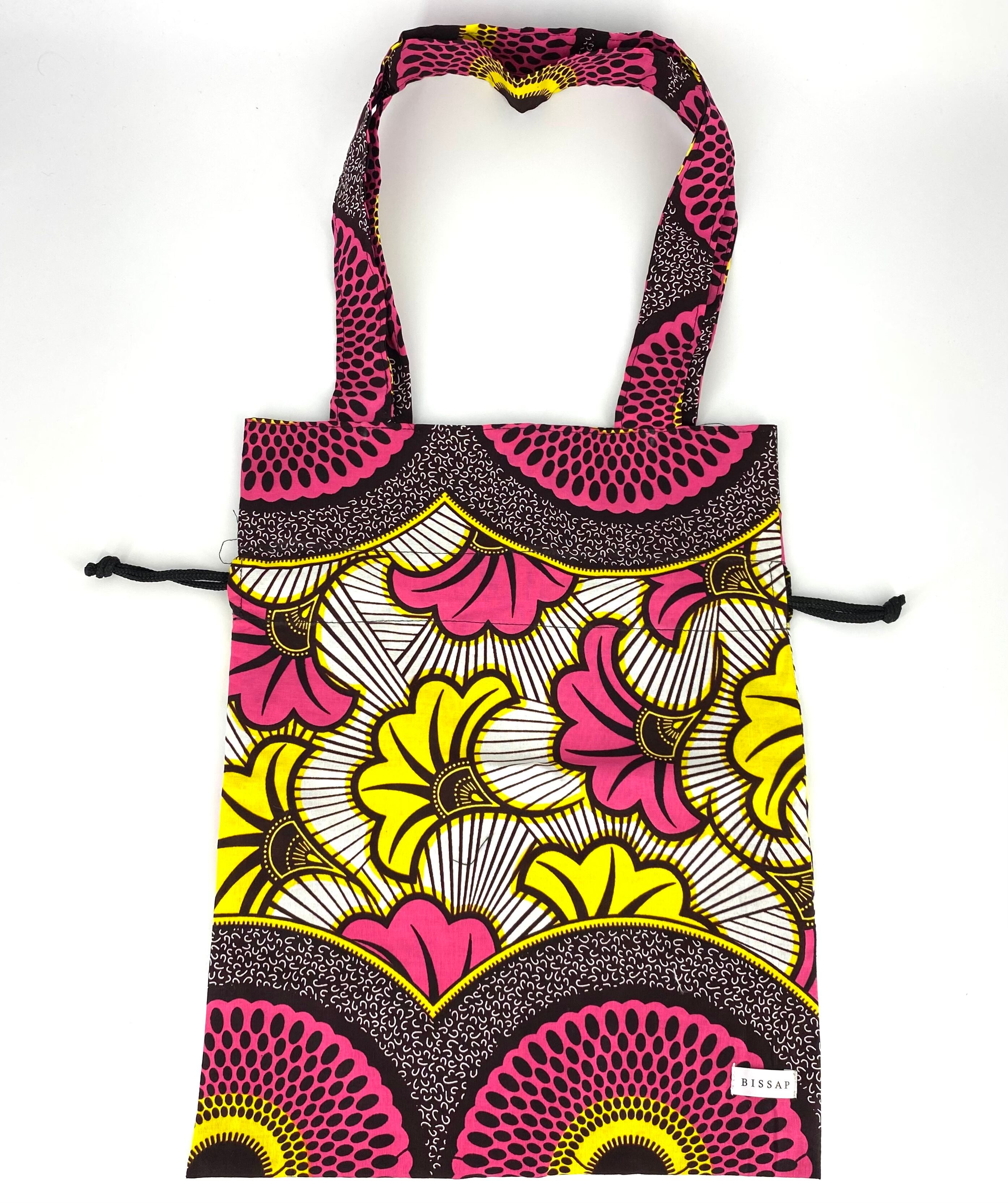 西アフリカのセネガルで仕立てた【BISSAP】オリジナルの巾着トートバッグ。
