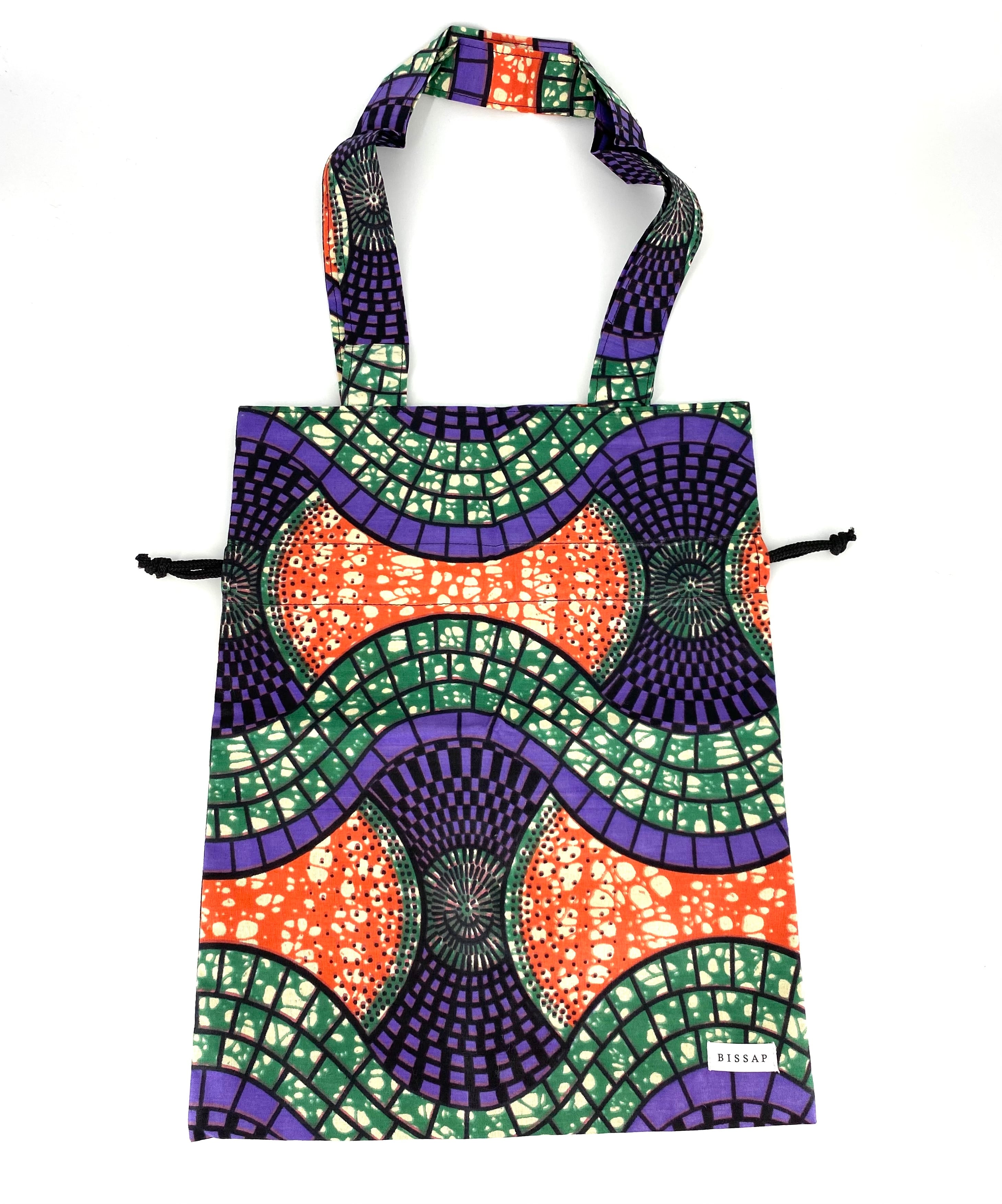 西アフリカのセネガルで仕立てた【BISSAP】オリジナルの巾着トートバッグ。